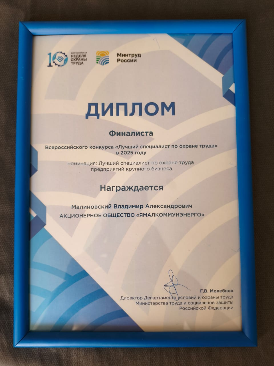 Владимир Малиновский, начальник отдела охраны труда и техники безопасности АО «Ямалкоммунэнерго», трехкратный победитель городского конкурса «Лучший специалист по охране труда города Салехарда», вошел в десятку лучших Всероссийского конкурса в области охраны труда.